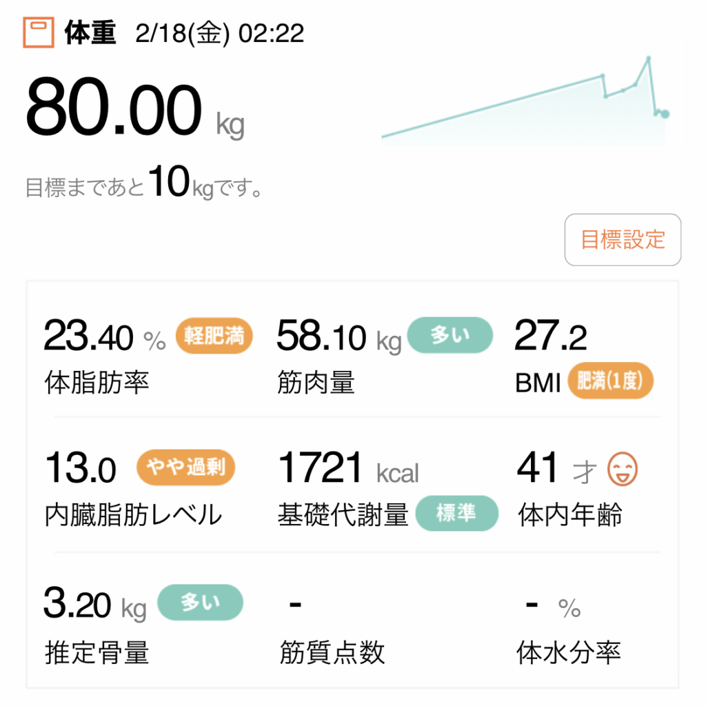 元に戻ったな。もうすこし79kgですよって安心できるところに落ちてほしいなあ。